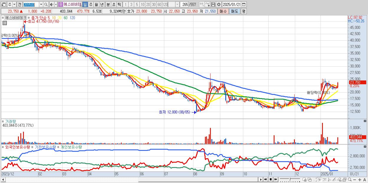 - 에스비비테크 (23,750원 ▲ 8.2% , 시총: 1,467억, 거래량: 403,044, 거래대금:93억)
