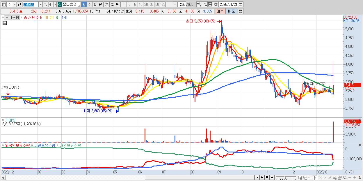 - 모나용평 (3,415원 ▲ 8.24% , 시총: 1,644억, 거래량: 6,613,667, 거래대금:244억)
