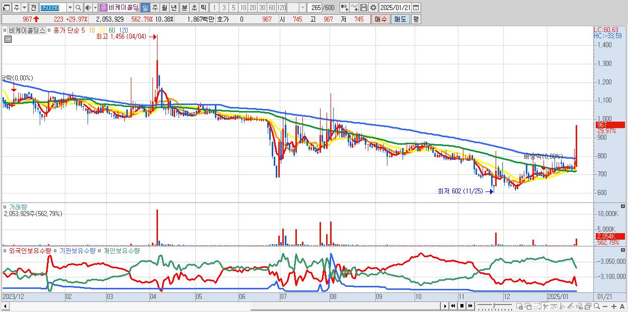- 비케이홀딩스 (967원 ▲ 29.97% , 시총: 191억, 거래량: 2,053,929, 거래대금:19억)