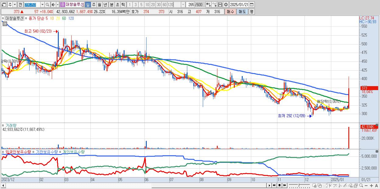 - 대창솔루션 (373원 ▲ 18.04% , 시총: 611억, 거래량: 42,933,662, 거래대금:164억)