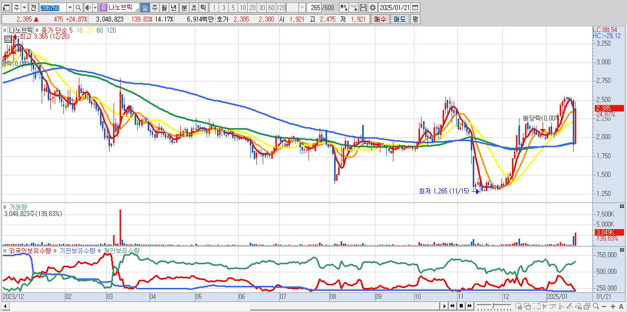- 나노브릭 (2,385원 ▲ 24.87% , 시총: 513억, 거래량: 3,048,823, 거래대금:69억)