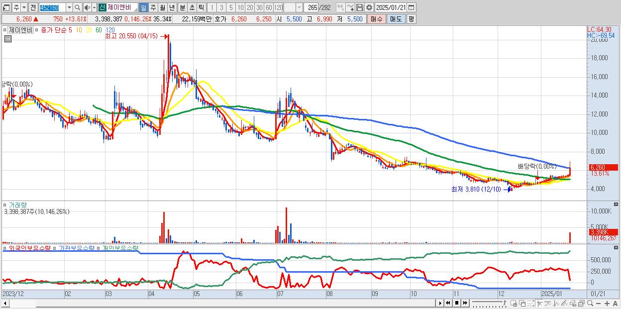 - 제이엔비 (6,260원 ▲ 13.61% , 시총: 602억, 거래량: 3,398,387, 거래대금:222억)