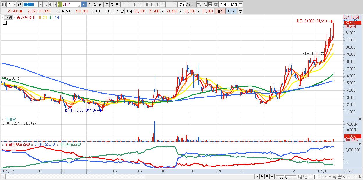 - 태광 (23,400원 ▲ 10.64% , 시총: 6,201억, 거래량: 2,107,502, 거래대금:486억)