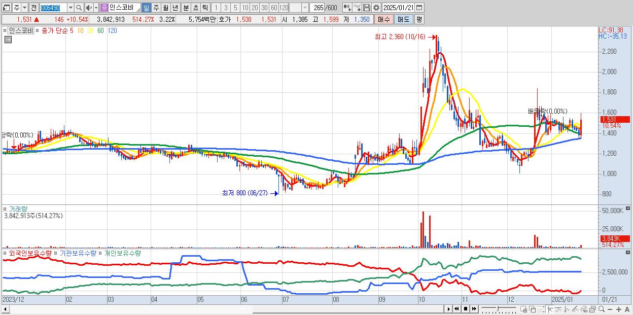 - 인스코비 (1,531원 ▲ 10.54% , 시총: 1,828억, 거래량: 3,842,913, 거래대금:58억)