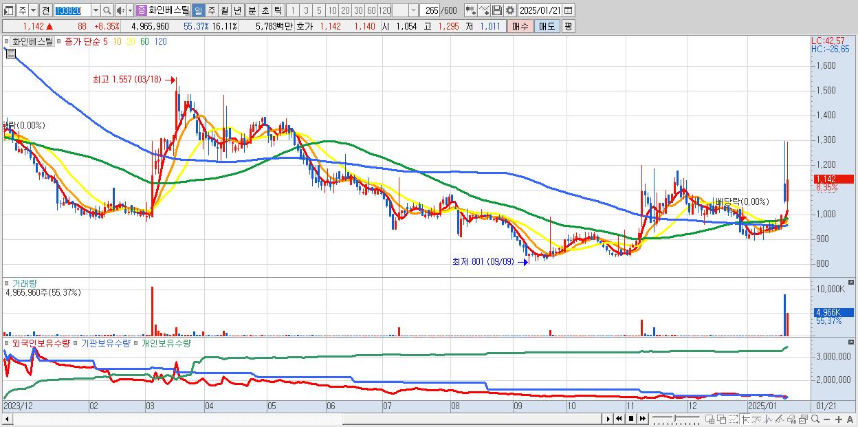 - 화인베스틸 (1,142원 ▲ 8.35% , 시총: 352억, 거래량: 4,965,960, 거래대금:58억)