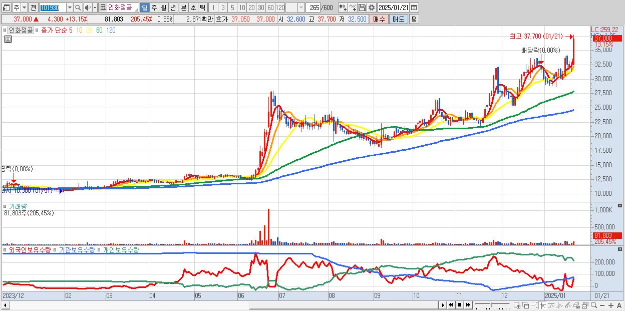 - 인화정공 (37,000원 ▲ 13.15% , 시총: 3,558억, 거래량: 81,803, 거래대금:29억)
