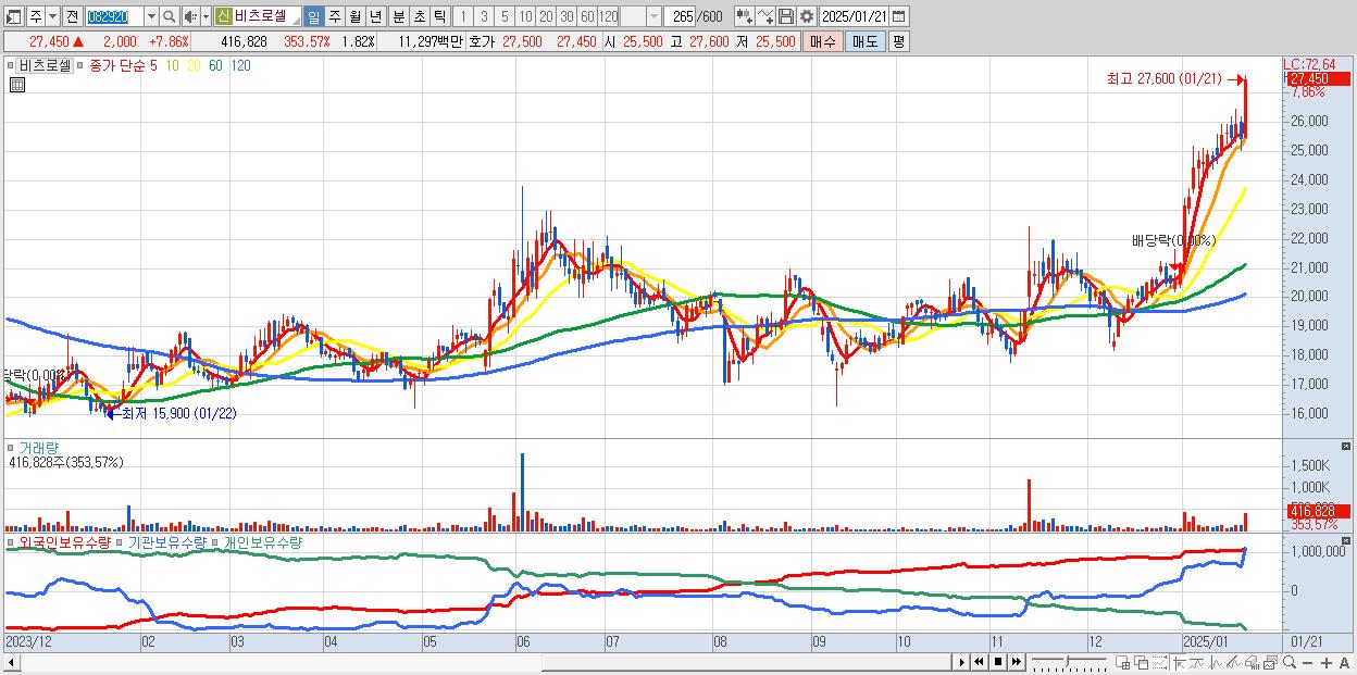 - 비츠로셀 (27,450원 ▲ 7.86% , 시총: 6,278억, 거래량: 416,828, 거래대금:113억)