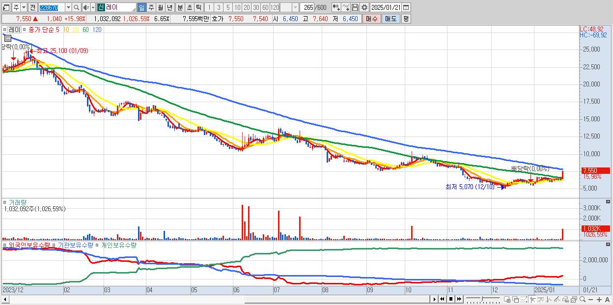 - 레이 (7,550원 ▲ 15.98% , 시총: 1,171억, 거래량: 1,032,092, 거래대금:76억)