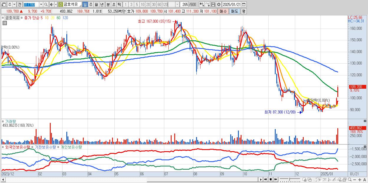 - 금호석유 (109,700원 ▲ 9.7% , 시총: 29,986억, 거래량: 493,862, 거래대금:533억)