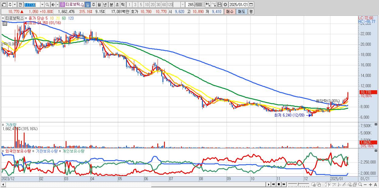 - 티로보틱스 (10,770원 ▲ 10.8% , 시총: 1,957억, 거래량: 1,662,476, 거래대금:171억)