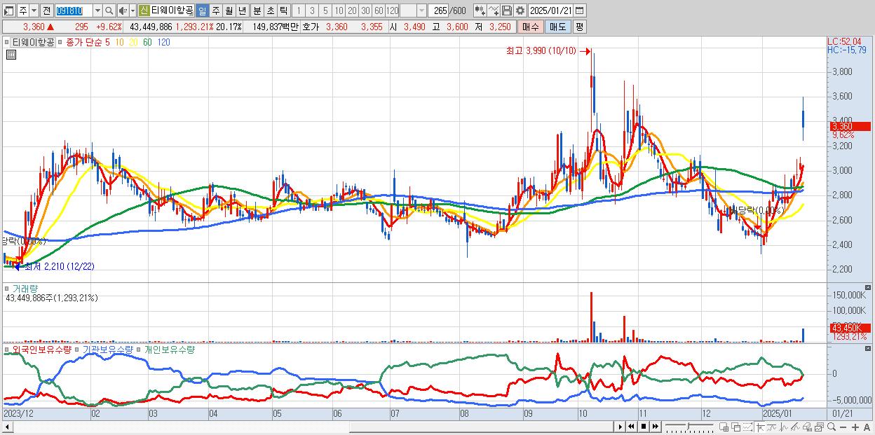 - 티웨이항공 (3,360원 ▲ 9.62% , 시총: 7,237억, 거래량: 43,449,886, 거래대금:1,498억)