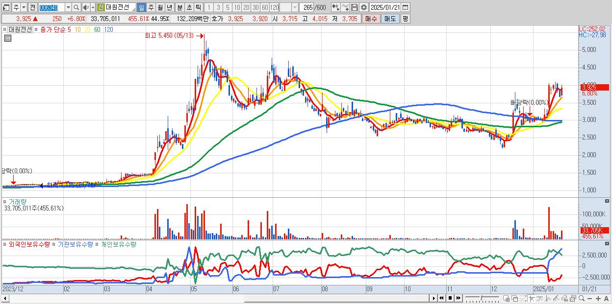 - 대원전선 (3,925원 ▲ 6.8% , 시총: 2,943억, 거래량: 33,705,011, 거래대금:1,322억)