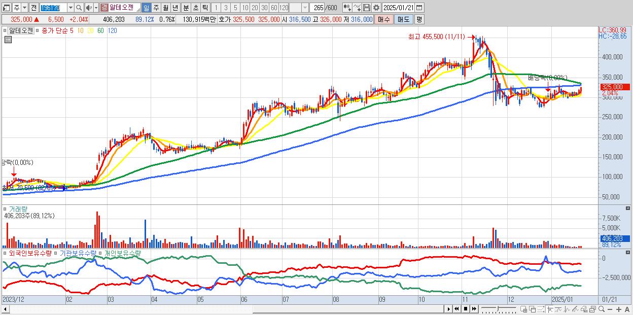 - 알테오젠 (325,000원 ▲ 2.04% , 시총: 173,286억, 거래량: 406,203, 거래대금:1,309억)