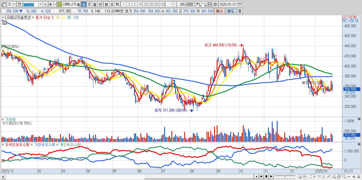 - LG에너지솔루션 (354,500원 ▼ -4.32% , 시총: 829,530억, 거래량: 317,052, 거래대금:1,130억)