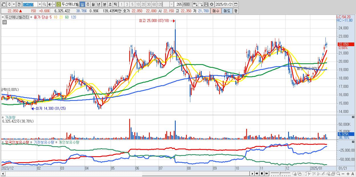 - 두산에너빌리티 (22,050원 ▲ 0.68% , 시총: 141,244억, 거래량: 6,325,422, 거래대금:1,394억)