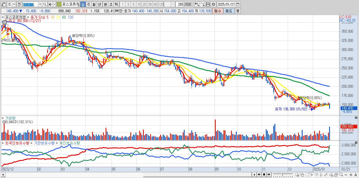 - 포스코퓨처엠 (140,400원 ▼ -9.88% , 시총: 108,758억, 거래량: 890,840, 거래대금:1,284억)