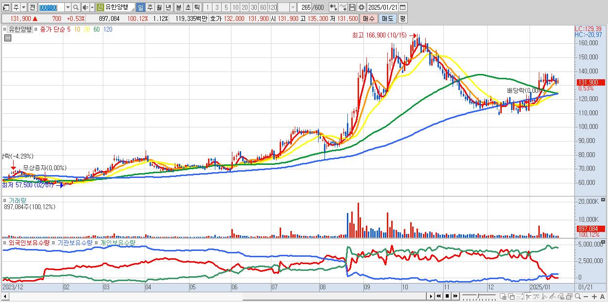 - 유한양행 (131,900원 ▲ 0.53% , 시총: 105,796억, 거래량: 897,084, 거래대금:1,193억)