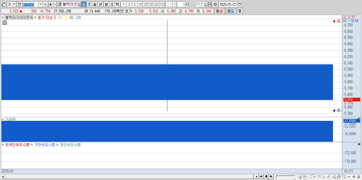 - 블랙야크아이앤씨 (5,520원 ▲ 5.75% , 시총: 1,341억, 거래량: 27,556,295, 거래대금:1,701억)