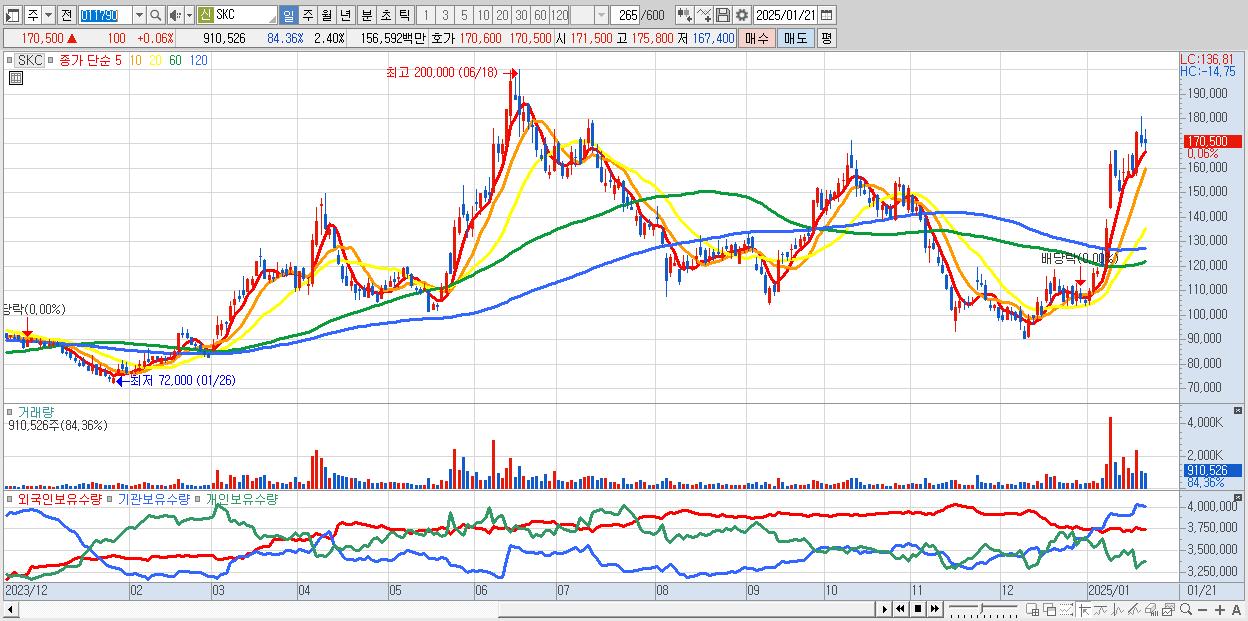 - SKC (170,500원 ▲ 0.06% , 시총: 64,565억, 거래량: 910,526, 거래대금:1,566억)