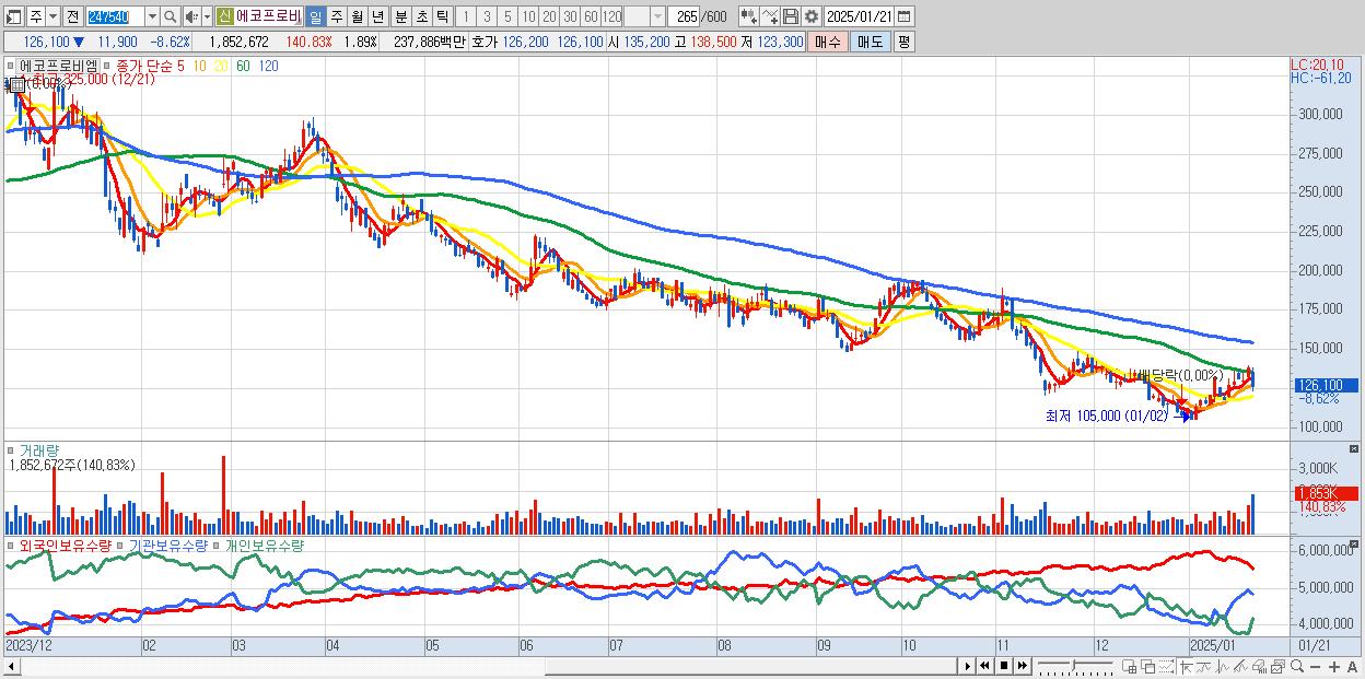 - 에코프로비엠 (126,100원 ▼ -8.62% , 시총: 123,327억, 거래량: 1,852,672, 거래대금:2,379억)