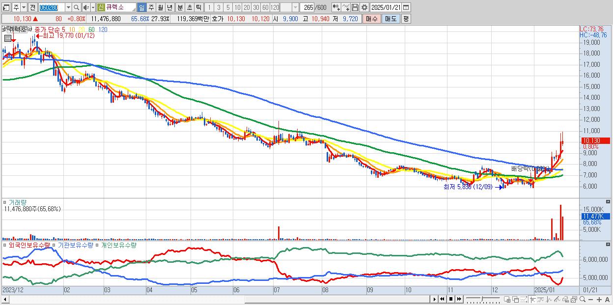 - 큐렉소 (10,130원 ▲ 0.8% , 시총: 4,162억, 거래량: 11,476,880, 거래대금:1,194억)