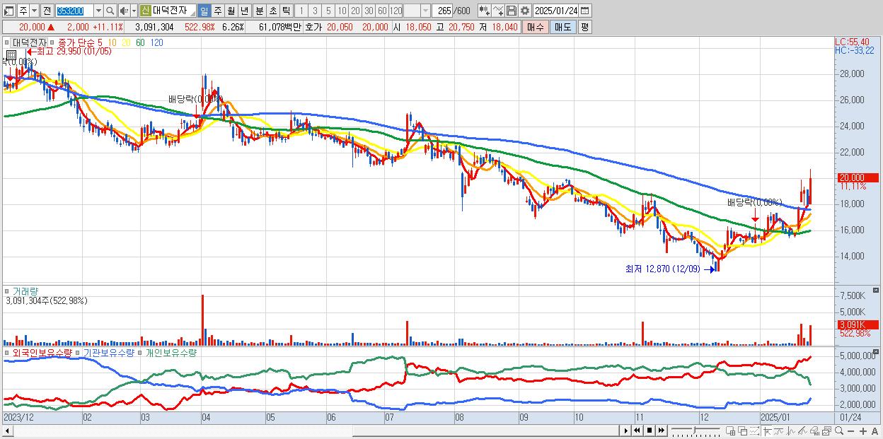 - 대덕전자 (20,000원 ▲ 11.11% , 시총: 9,883억, 거래량: 3,091,304, 거래대금:611억)