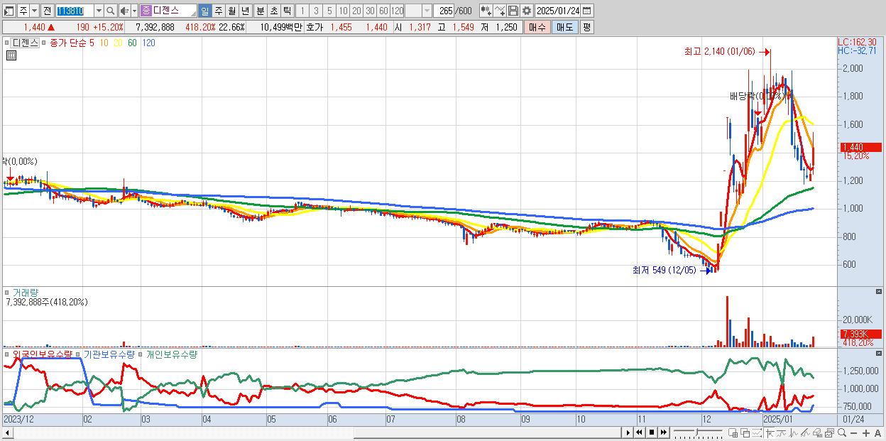 - 디젠스 (1,440원 ▲ 15.2% , 시총: 470억, 거래량: 7,392,888, 거래대금:105억)