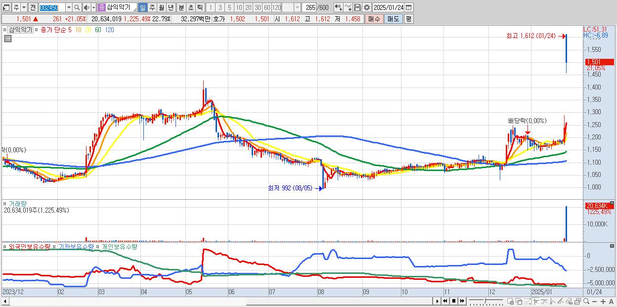 - 삼익악기 (1,501원 ▲ 21.05% , 시총: 1,359억, 거래량: 20,634,019, 거래대금:323억)