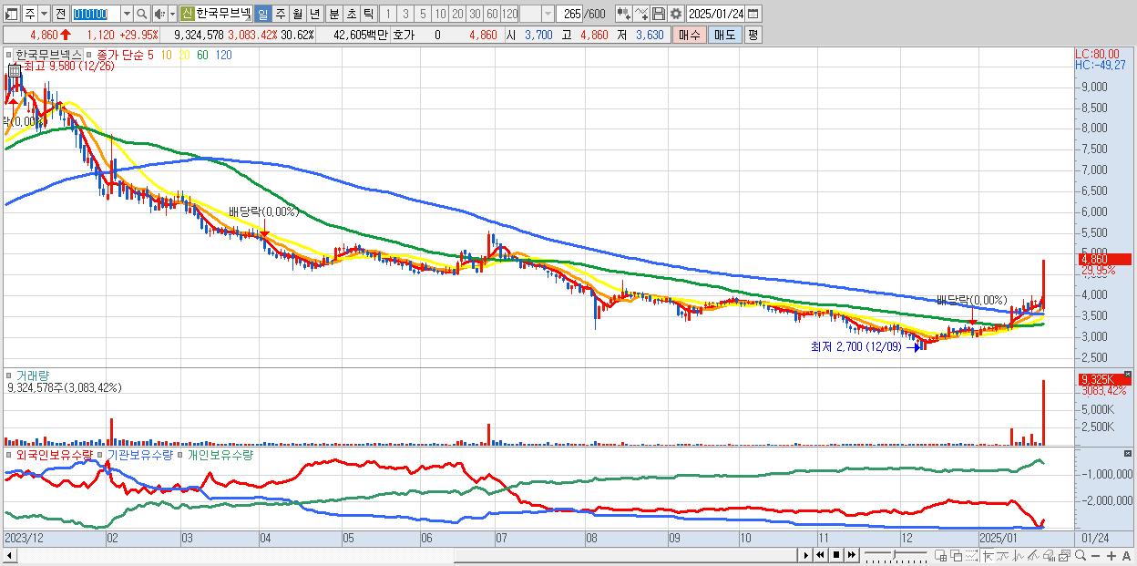 - 한국무브넥스 (4,860원 ▲ 29.95% , 시총: 1,480억, 거래량: 9,324,578, 거래대금:426억)
