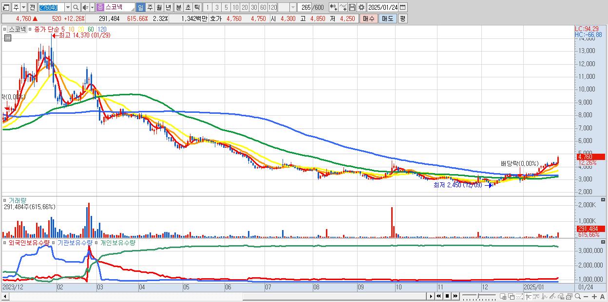 - 스코넥 (4,760원 ▲ 12.26% , 시총: 598억, 거래량: 291,484, 거래대금:13억)