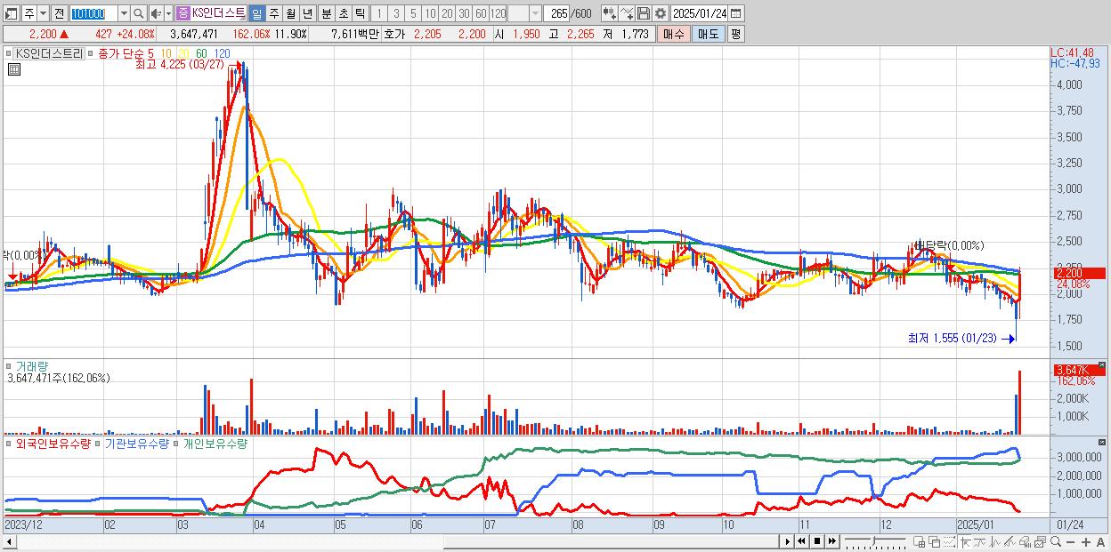 - KS인더스트리 (2,200원 ▲ 24.08% , 시총: 674억, 거래량: 3,647,471, 거래대금:76억)