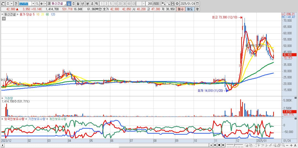 - 동신건설 (42,900원 ▲ 10.14% , 시총: 3,604억, 거래량: 1,414,708, 거래대금:620억)