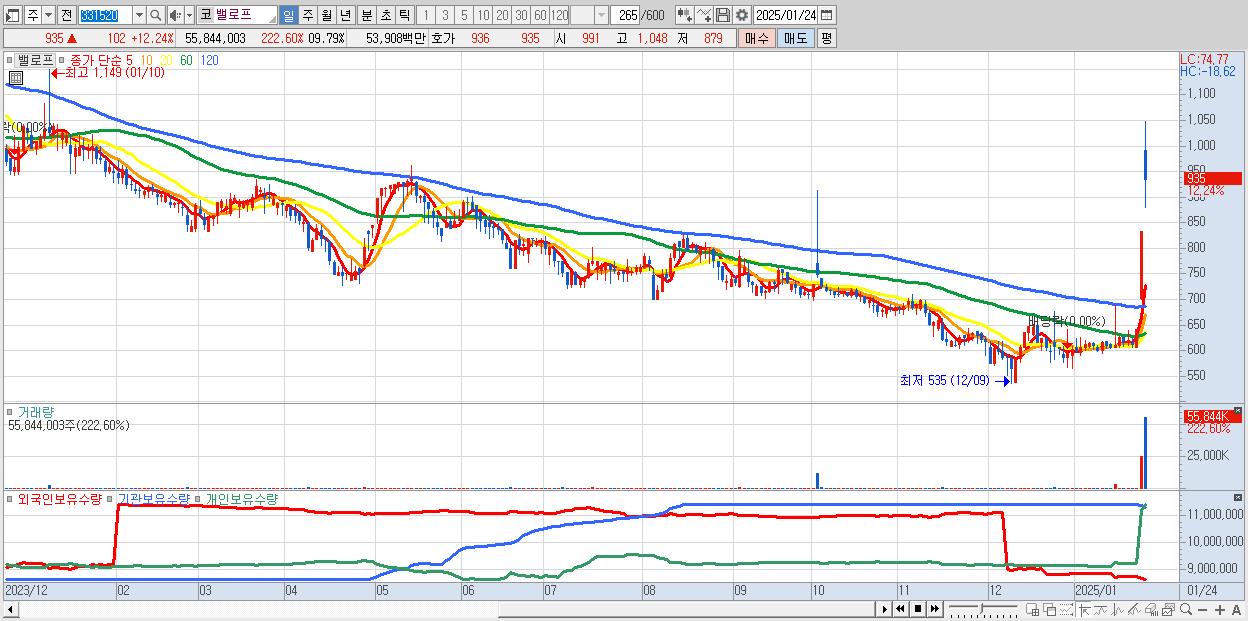 - 밸로프 (935원 ▲ 12.24% , 시총: 476억, 거래량: 55,844,003, 거래대금:539억)