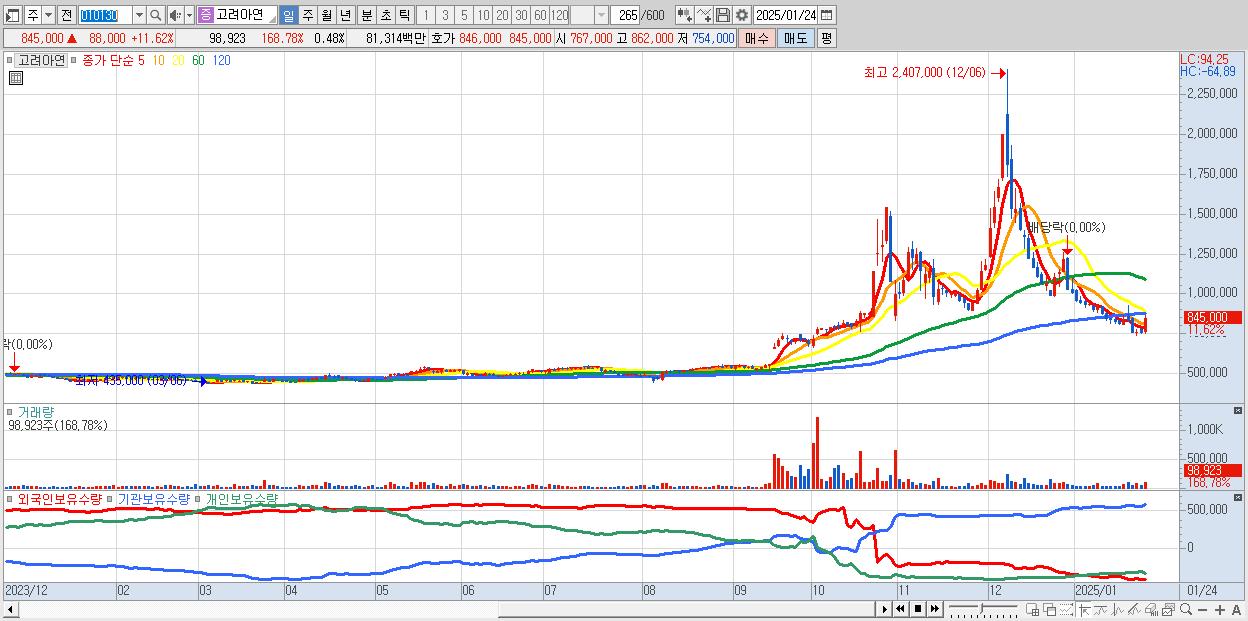 - 고려아연 (845,000원 ▲ 11.62% , 시총: 174,943억, 거래량: 98,923, 거래대금:813억)