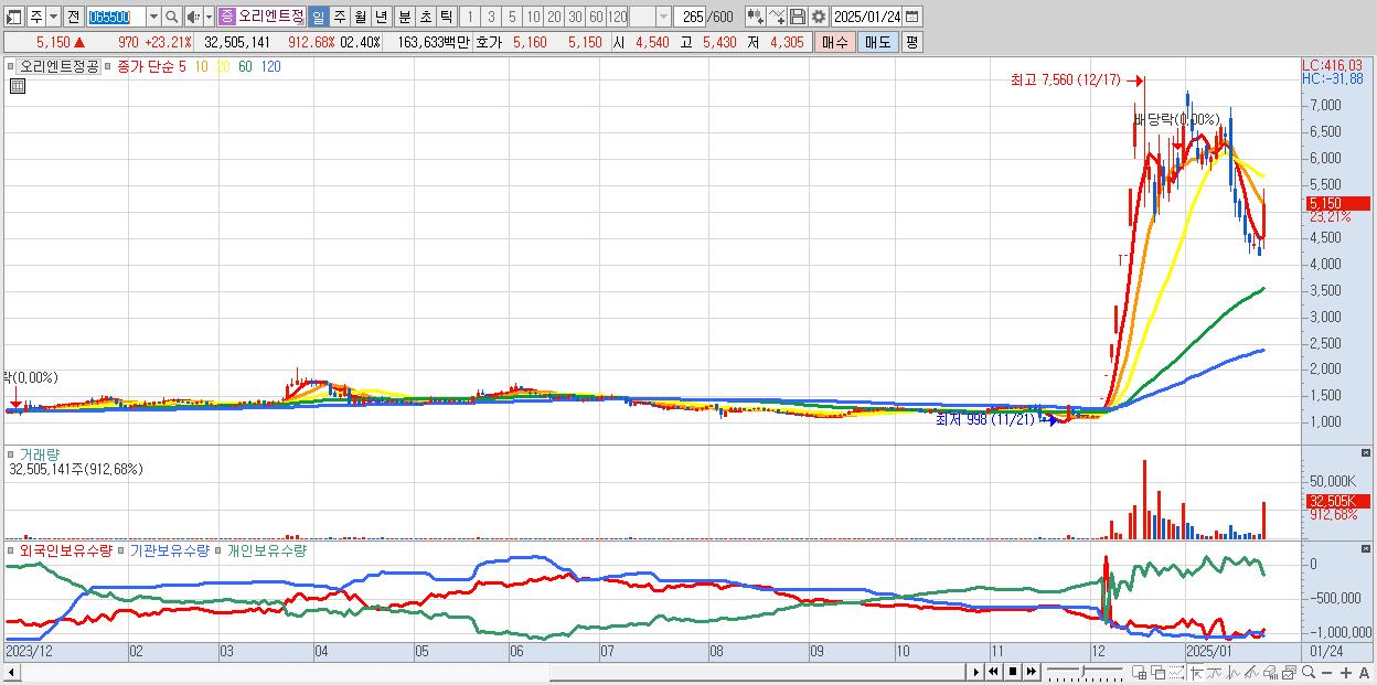 - 오리엔트정공 (5,150원 ▲ 23.21% , 시총: 1,635억, 거래량: 32,505,141, 거래대금:1,636억)