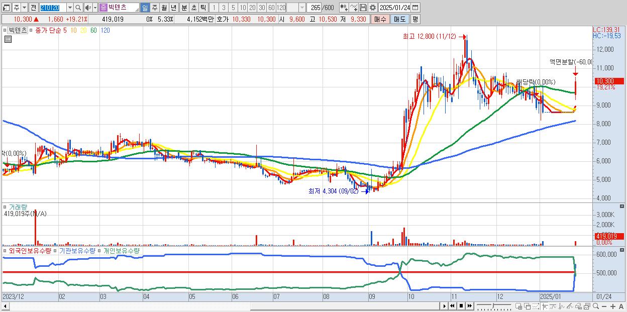 - 빅텐츠 (10,300원 ▲ 19.21% , 시총: 810억, 거래량: 419,019, 거래대금:42억)