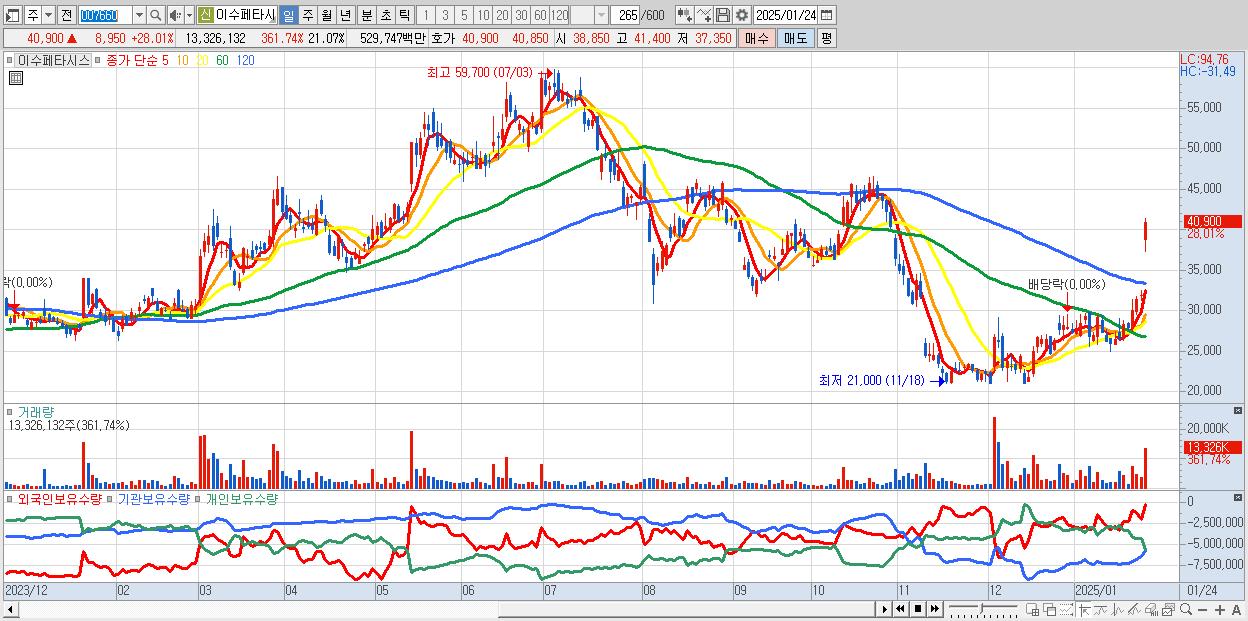 - 이수페타시스 (40,900원 ▲ 28.01% , 시총: 25,868억, 거래량: 13,326,132, 거래대금:5,297억)