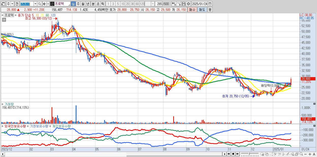 - 프로텍 (28,800원 ▲ 11.2% , 시총: 3,168억, 거래량: 156,487, 거래대금:45억)