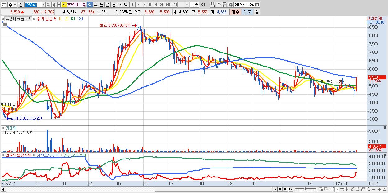 - 휴먼테크놀로지 (5,520원 ▲ 17.7% , 시총: 1,188억, 거래량: 418,614, 거래대금:22억)