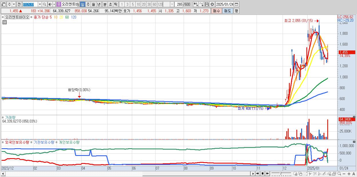- 오리엔트바이오 (1,455원 ▲ 14.39% , 시총: 1,725억, 거래량: 64,339,627, 거래대금:951억)