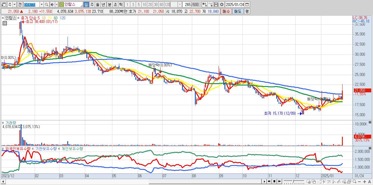 - 인탑스 (21,050원 ▲ 11.55% , 시총: 3,621억, 거래량: 4,078,634, 거래대금:882억)