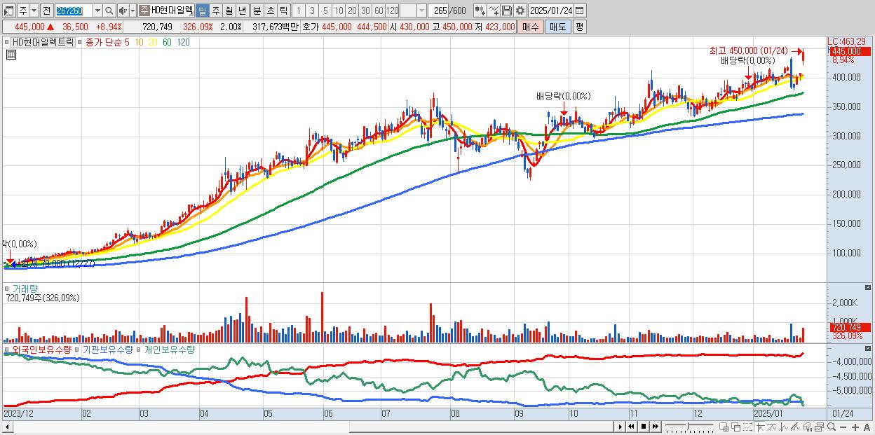 1.HD현대일렉트릭 445,000원 ▲ 8.94% (KOSPI, 267260)
