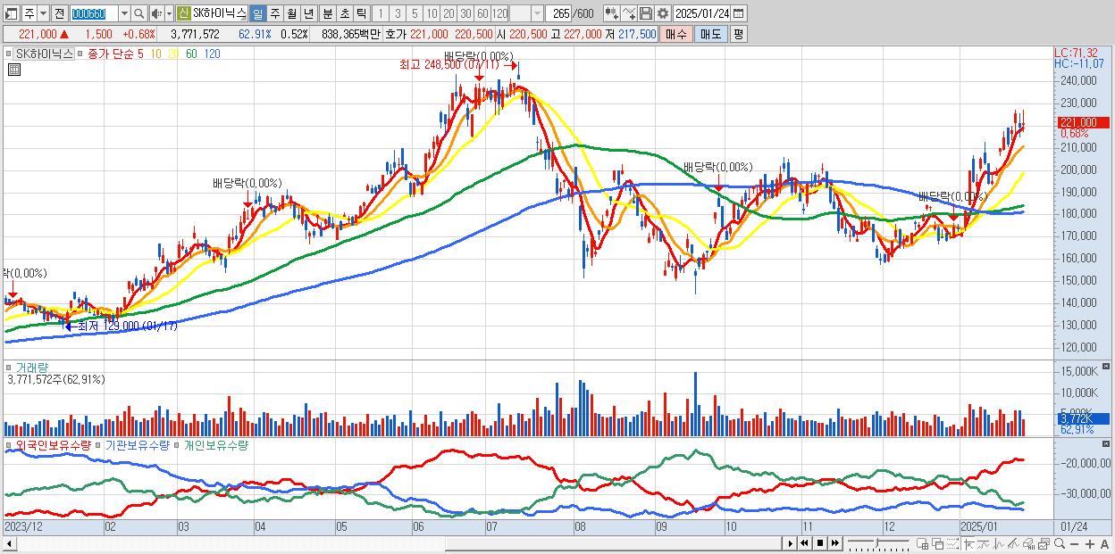 - SK하이닉스 (221,000원 ▲ 0.68% , 시총: 1,608,885억, 외국인 순매수 거래금:167억)