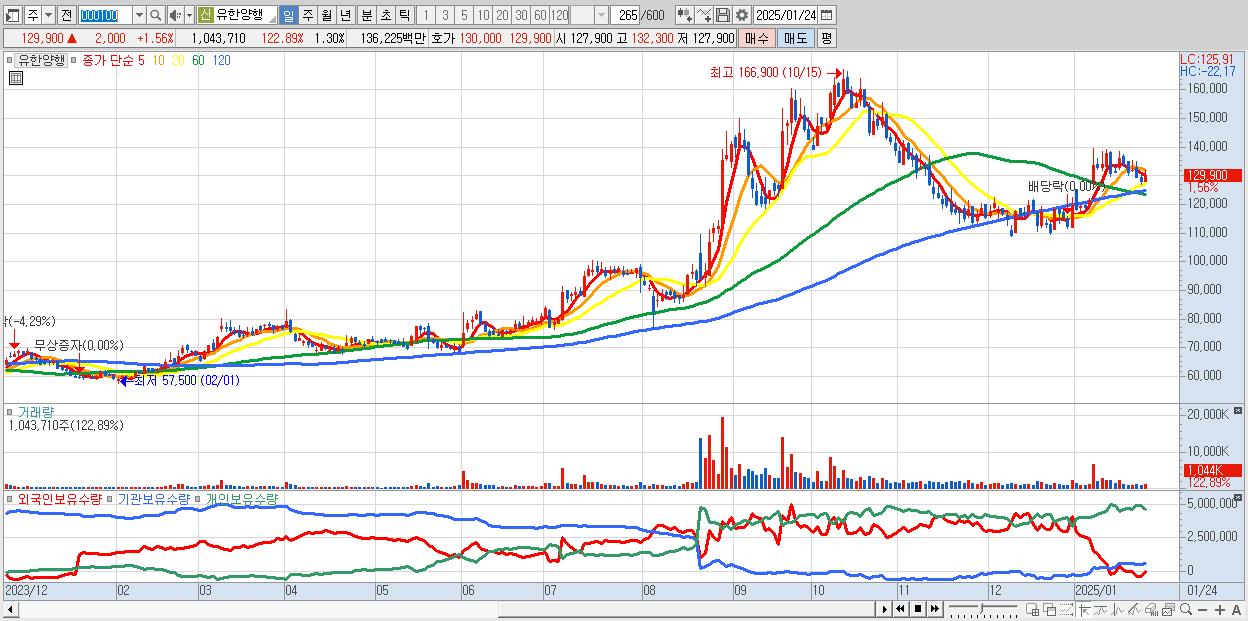 - 유한양행 (129,900원 ▲ 1.56% , 시총: 104,192억, 외국인 순매수 거래금:181억)