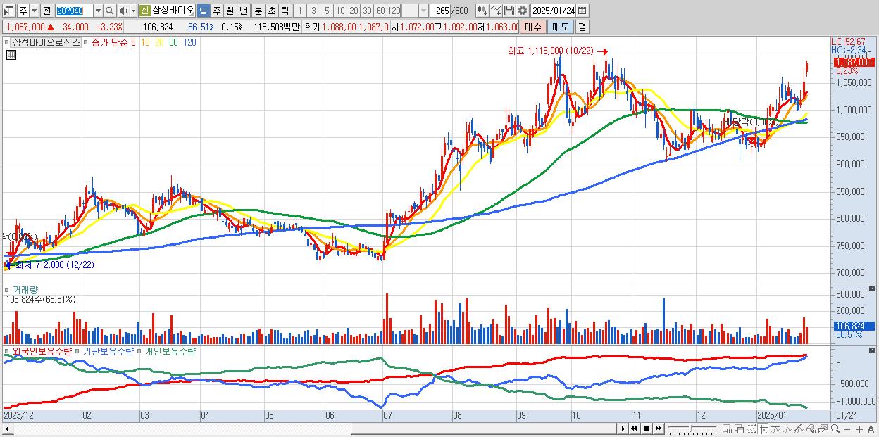 - 삼성바이오로직스 (1,087,000원 ▲ 3.23% , 시총: 773,661억, 외국인 순매수 거래금:132억)
