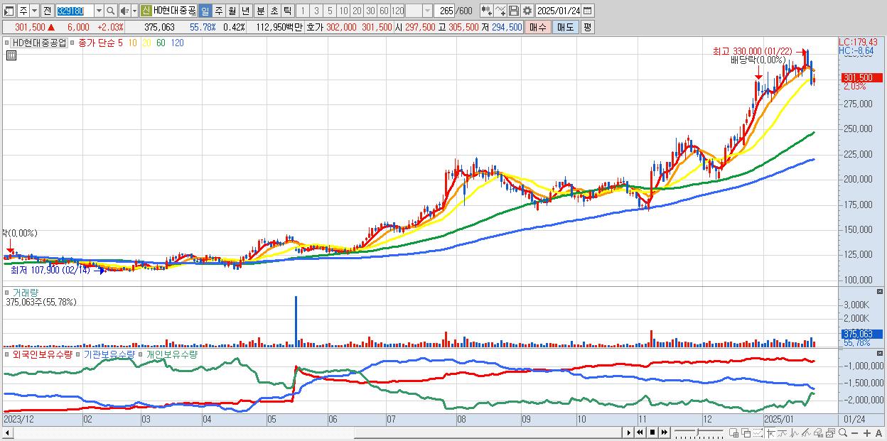 - HD현대중공업 (301,500원 ▲ 2.03% , 시총: 267,651억, 외국인 순매수 거래금:102억)
