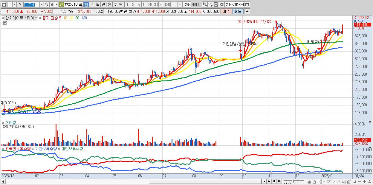 - 한화에어로스페이스 (411,500원 ▲ 7.3% , 시총: 187,566억, 외국인 순매수 거래금:825억)