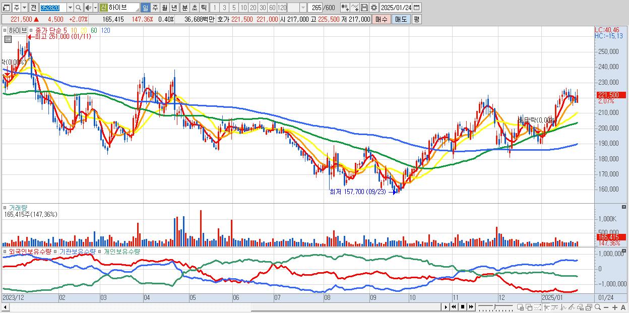 - 하이브 (221,500원 ▲ 2.07% , 시총: 92,259억, 외국인 순매수 거래금:62억)