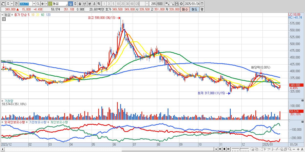 - 농심 (349,000원 ▲ 4.49% , 시총: 21,228억, 외국인 순매수 거래금:80억)