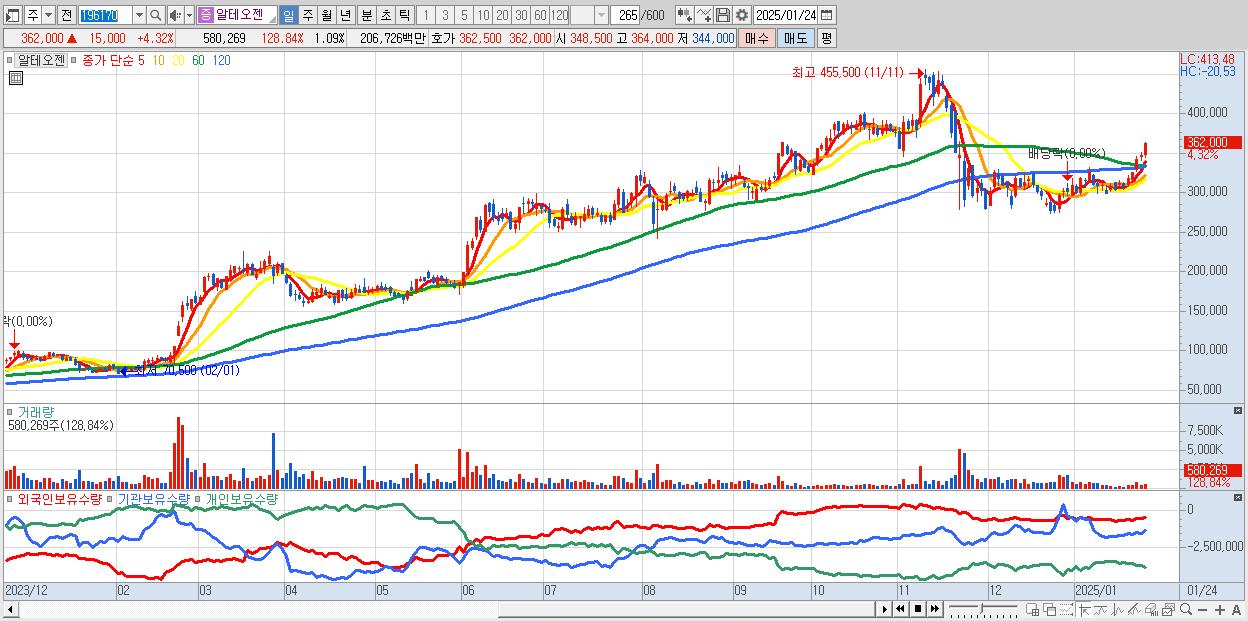 - 알테오젠 (362,000원 ▲ 4.32% , 시총: 193,014억, 외국인 순매수 거래금:222억)